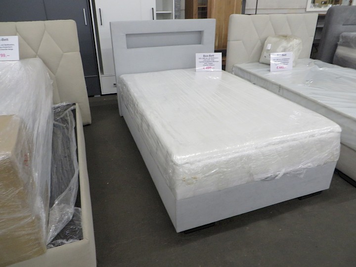 120 x 200 cm, mit Bettkasten, LED-Licht, feste Taschen-Federkern-Matratze, Topper, Chenille hellgrau