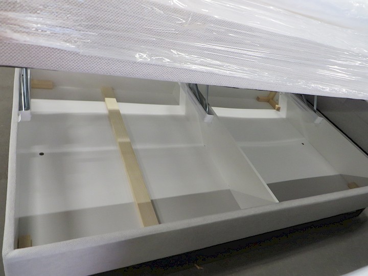120 x 200 cm, mit seitlich aufklappbarem Bettkasten, Unterbau mit Bonnell-Federkern, lose Taschen-Federkern-Matratze, Topper, Chenille grau