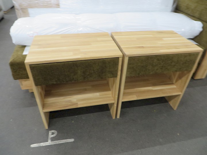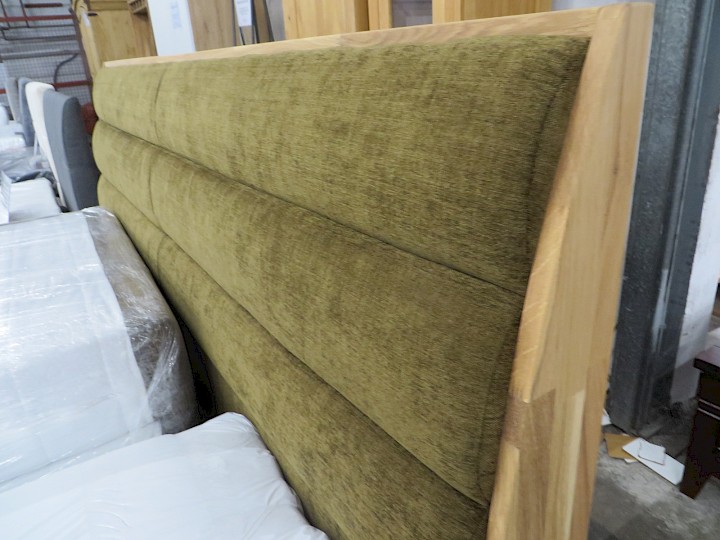 200 x 200 cm, mit 2 x Nachtkommode, 2 x seitlich aufklappbarer Bettkasten, lose Taschen-Federkern-Matratzen, Topper, Chenille oliv / Eiche massiv geölt