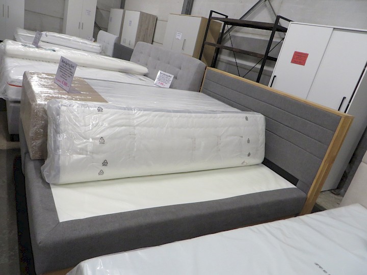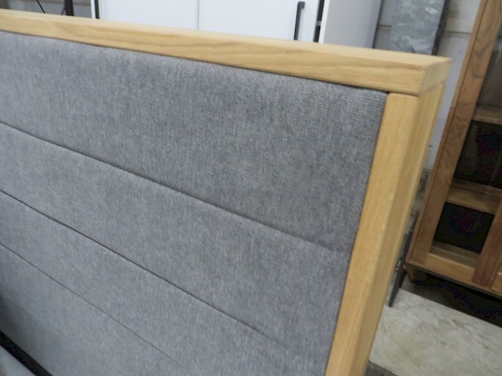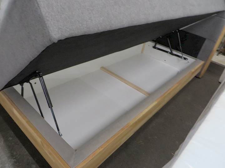 180 x 200 cm, 2 x seitlich aufklappbarer Bettkasten, Unterbau mit Bonnell-Federkern, lose Taschen-Federkern-Matratzen, Topper, Chenille grau / Eiche massiv geölt