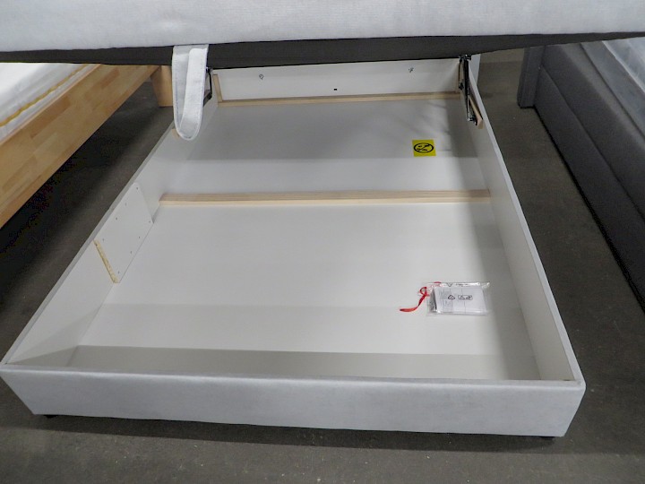 140 x 200 cm, mit Bettkasten, Unterbau mit Bonnell-Federkern, lose Taschen-Federkern-Matratze (H3), Topper, Chenille hellgrau