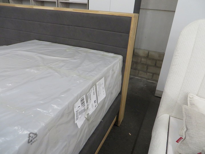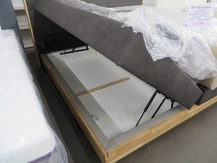 200 x 200 cm, 2 x seitlich aufklappbarer Bettkasten, Unterbau mit Bonnell-Federkern, lose Taschen-Federkern-Matratzen (H3), Topper, Alcatex anthrazit / Eiche massiv geölt