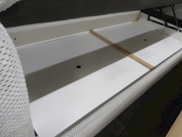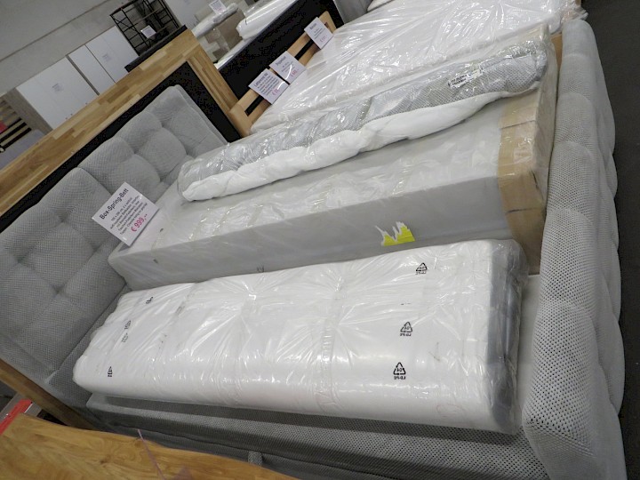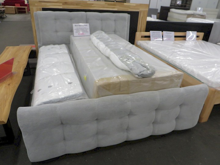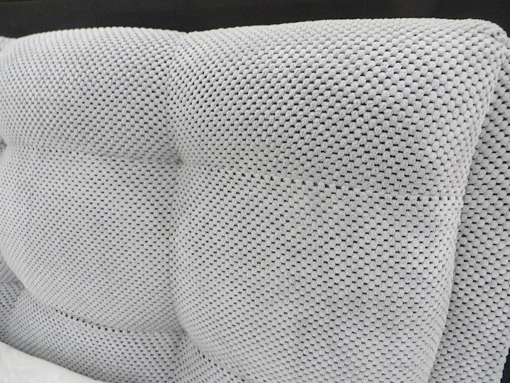 180 x 200 cm, 2 x seitlich aufklappbarer Bettkasten, Unterbau mit Bonnell-Federkern, lose Taschen-Federkern-Matratzen (H4), Topper, Chenille hellgrau geprägt