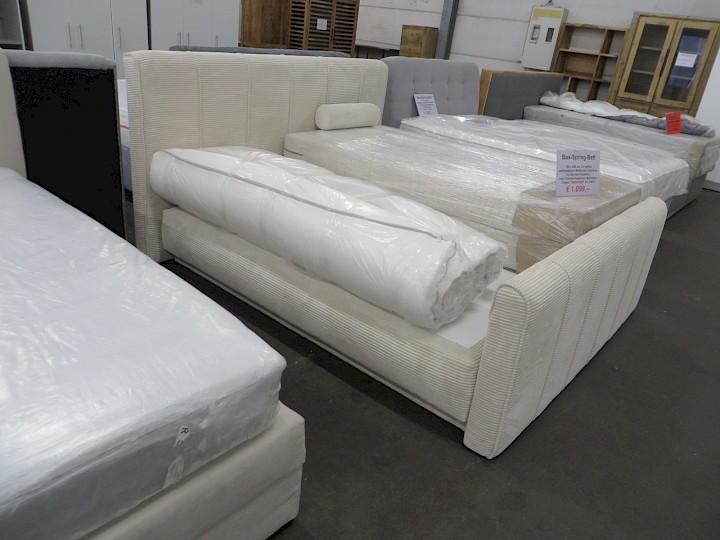 180 x 200 cm, 2 x seitlich aufklappbarer Bettkasten, Unterbau mit Bonnell-Federkern, lose Taschen-Federkern-Matratzen, Topper, "Samt-Cord" creme
