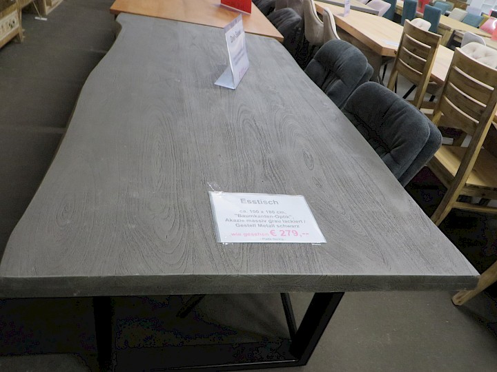 ca. 100 x 180 cm, "Baumkanten-Optik", Akazie massiv grau lackiert / Gestell Metall schwarz