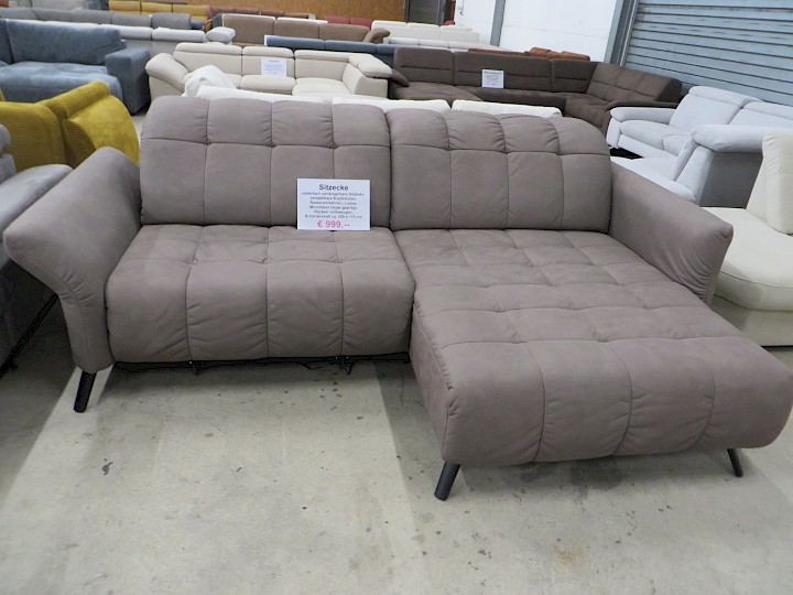 elektrisch verlängerbare Sitztiefe, verstellbare Kopfstützen, Rasterarmlehnen, Luxus-Microfaser taupe geprägt, Rücken vollbezogen, Schenkelmaß ca. 250 x 175 cm