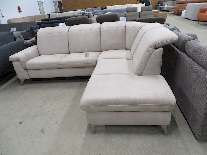 mit Bettkasten, Rasterarmlehne, verstellbare Kopfstützen, Feinchenille sand, Rücken vollbezogen, Schenkelmaß ca. 270 x 230 cm