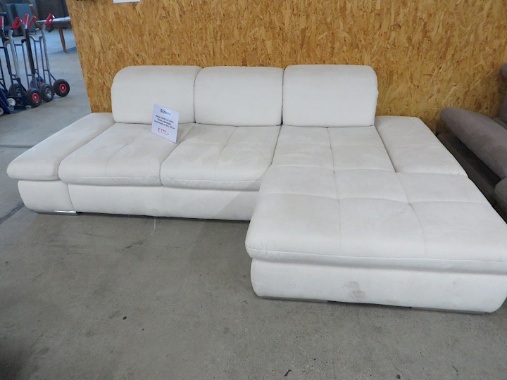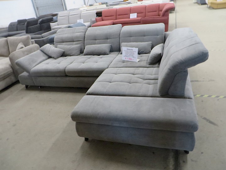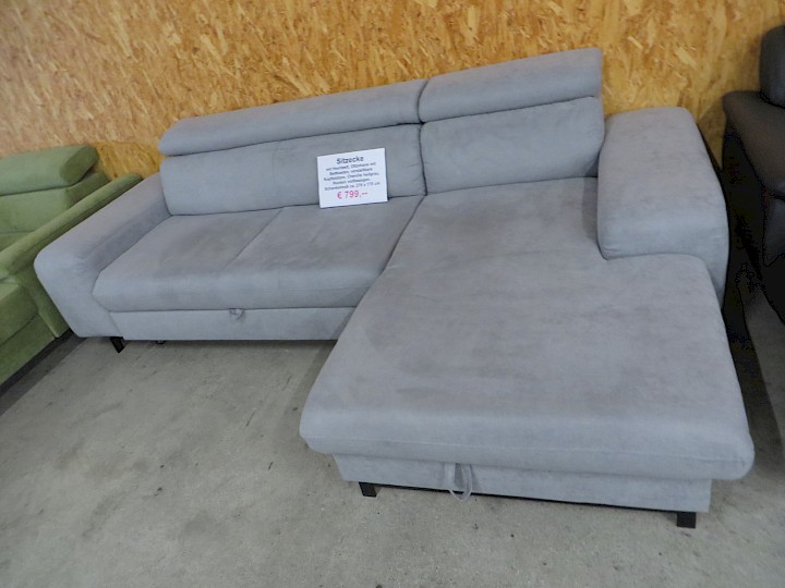 mit Hochbett, Rasterarmlehnen, 5 x Sitztiefenverstellung, verstellbare Kopfstützen, Rücken vollbezogen, Chenille hellgrau, Schenkelmaß ca. 320 x 230 cm