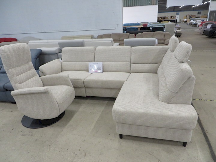 3 x Sitztiefenverstellung, verstellbare Kopfstützen, Rasterarmlehne, Chenille beige / Alcatex mokka, Rücken vollbezogen, Schenkelmaß ca. 300 x 200 cm