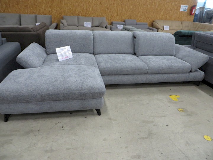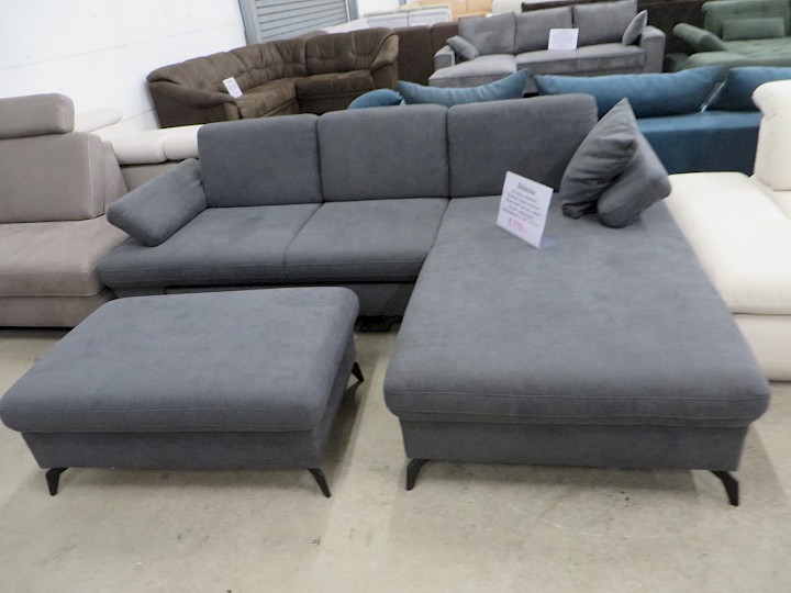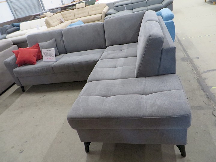 1 x elektrisch verlängerbare Ottomane, 2 x Sitztiefenverstellung, verstellbare Kopfstützen, Rasterarmlehnen, "Flausch-Chenille" grau meliert, Rücken bezogen, Schenkelmaß ca. 190 x 330 cm