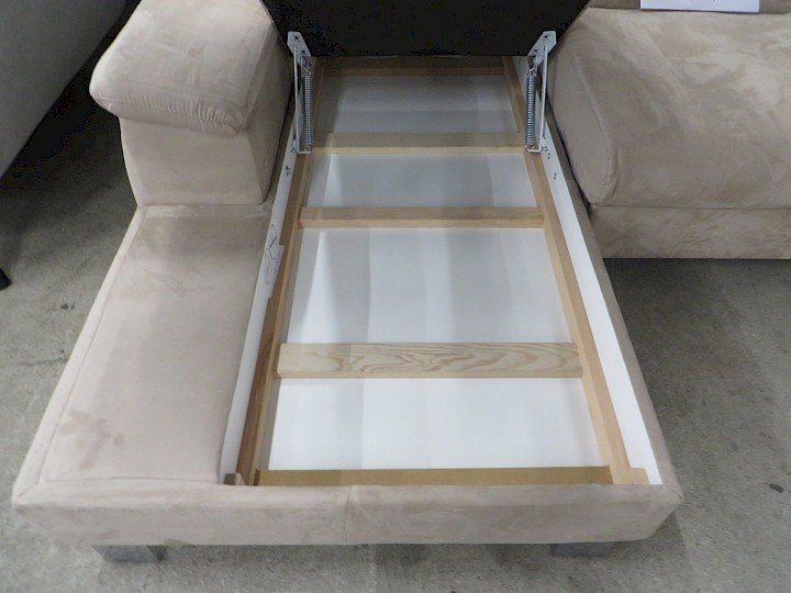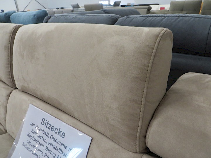 mit Hochbett, Ottomane mit Bettkasten, verstellbare Kopfstützen, Bezug Alcatex cappuccino, Rücken bezogen, Schenkelmaß ca. 160 x 240 cm