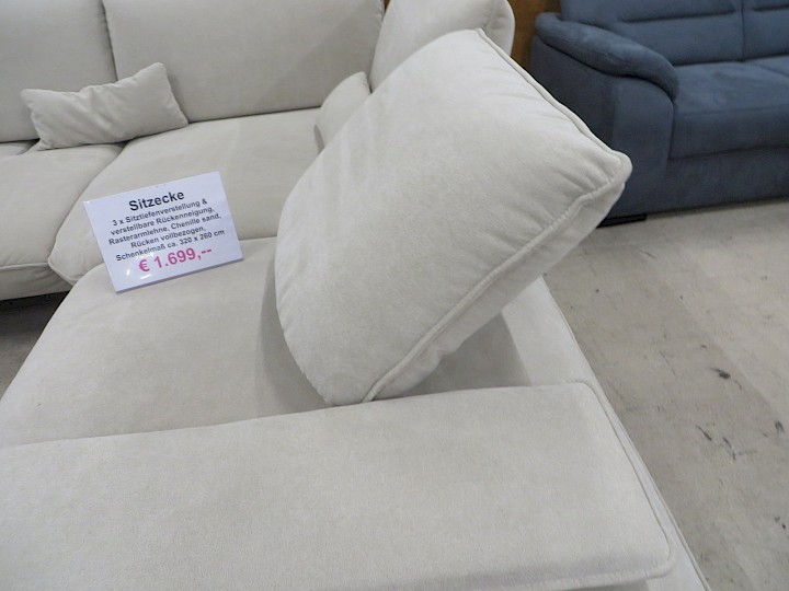 3 x Sitztiefenverstellung & verstellbare Rückenneigung, Rasterarmlehne, Chenille sand, Rücken vollbezogen, Schenkelmaß ca. 320 x 260 cm